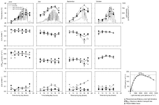 The photosynthetic activity was monitored in June, July, September and October 2018 during 6th and 8th day of each cultivation, each day between 6 a.m. and 6 p.m., with a temporal resolution of two hours. The highest photosynthesis efficiency and capacity in C. pyrenoidosa cultures were determined in June and October when the daily temperature maxima did not exceed 36 °C (Figure 5). In July and September, when the temperature rose to 38 °C, both photosynthetic efficiency and photosynthetic capacity decreased. The maximal photosynthesis drops in the daytime were measured in both July and September at 4 p.m., and the drop was higher in MTA PBR compared to H-T PBR. The reduction of photosynthesis efficiency was accompanied by a slight increase of photoinhibition factor β (see Equation (4) for details). However, we noted that during the photosynthesis efficiency measurement, the cultures were light-limited rather than photo-inhibited, as reflected by the courses of light curves showing that both ETRmax (see Equation (5) for details) and β were detected at actinic light intensities of 2000 µmol photons m−2 s−1 or higher (Supplementary Figure S1), whereas light available for both photobioreactors did not exceed 1000 µmol photons m−2 s−1 in any of the measured days (Figure 5).