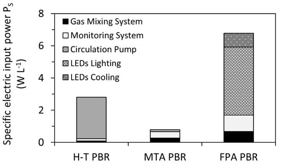 However, since the working volumes of H-T, MTA, and FPA PBRs were not identical, for direct electric input power comparison it was necessary, to further normalize the specific values per L culture. As summarized in Figure 6, the highest specific electric input power PS was identified in FPA PBR (working volume 25 L) as PS_FPA = 6.8 ± 0.1 W L−1. Such a high value is related specially to LED lighting and cooling which accounts for about 75% of the total FPA input power (Figure 6). In H-T PBR (working volume 200 L), PS_H-T was identified as 2.8 ± 0.1 W L−1, and to the power consumption was mainly related to the operation of a circulation pump which accounted for more than 92% of the total H-T PBR’s specific electric input power. The lowest consumption was determined in the MTA PBR (of working volume 60 L) with PS_MTA = 0.79 ± 0.03 W L−1. In addition to the basic components (gas mixing and monitoring systems), the MTA PBR was only equipped with a small external pump which secured a culture flow through the monitoring system.