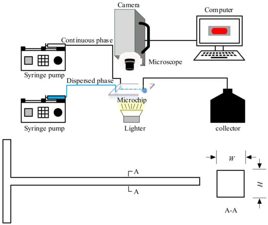 Figure 1 shows a schematic diagram of the experimental setup and the geometric details of the tested microchannel. A convective T-junction microchannel (w × h = 400 × 400 μm) fabricated on a PMMA plate by micromachining technology was used as the reactor and was sealed by another PMMA cover plate. To form a closed microchannel section for fluid passage, screw fittings were used to perforate the edges of both plates. The dispersed phase (silicone oil) and continuous phase (distilled water with SDS) were delivered by two high-precision syringe pumps (LSP01-1A, LongerPump, Baoding, China) to the convective T-junction microchannel. A collector was also set up to collect the waste liquid. A high-speed camera (Photron Nova S6, Tokyo, Japan) connected to a computer was placed directly above the microchannel to record the flow pattern of the immiscible liquids (silicone oil and water). A 150 W light source was used to provide the illumination intensity needed for clear image recording.
