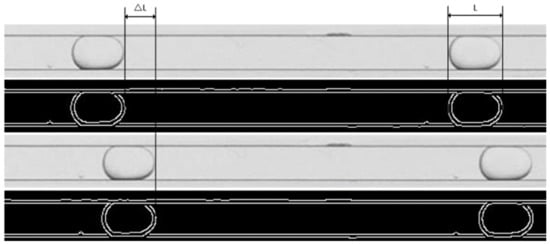 To prevent the silicone oil from accumulating in the corner of the microchannel, the microchannel needed to be initially saturated by water before the experiments began. The continuous phase (water) must fill the channel before the dispersed phase (silicon oil) is injected. The volumetric flow rate of the dispersed phase should be kept constant while increasing the volumetric flow rate of the continuous phase. During the experiment, the volumetric flow rate ranges of the dispersed and continuous phases were qd = 1–10 mL/h, qc = 5–200 mL/h, and the main flow patterns observed were slug flow, droplet flow, and jet flow. A high-speed camera was located 60 mm downstream of the inlet, and snapshots of flow patterns were captured once the flow pattern was stable. In this study, the Canny edge detection algorithm in MATLAB was used to process the image, obtain the flow pattern contour lines, and determine the droplet length L according to the corresponding pixel values and the actual size, as shown in Figure 2. The lengths were extracted and averaged from 50 snapshots. After the experiment, the microchannels must be thoroughly cleaned to remove residual chemicals and then dried when replacing the silicone oil with one of a different viscosity. According to the experimental results of three pairs of liquid–liquid systems, a proportional law governing the slug flow and droplet flow lengths was proposed and was further validated by existing literature data.