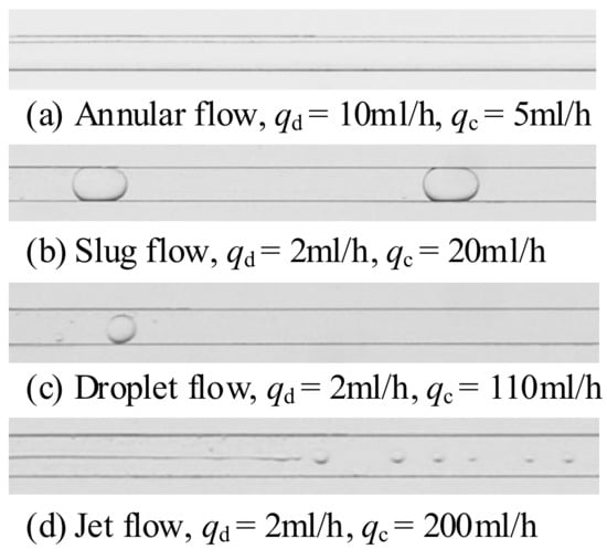 Annular flow (Figure 3a) was observed when the flow ratio was large (the ratio of dispersed phase flow rate to continuous phase flow rate). In this regime, the inertial force of the dispersed phase cannot be ignored and plays a leading role in the liquid–liquid system, so that the dispersed phase can maintain continuous flow in the microchannel without being cut off by the continuous phase (water). The dispersed phase flowed continuously in the core of the microchannel, and the continuous phase flowed around the discrete phase near the wall of the microchannel. In some cases, slight waviness could be observed at the interface, which was also reported in [47]. This waviness was caused by Kelvin–Helmholtz instability due to the flow rate difference across the interface between the two fluids.