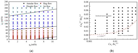 Figure 4a shows that as qd increases, the flow pattern transition lines all move upwards, and as qc increases, the flow pattern transitions from annular flow to slug flow, droplet flow, and jet flow in sequence. An increase in the flow rate of the dispersed phase will delay the droplets from entering the next flow pattern, whereas an increase in the flow rate of the continuous phase will promote the flow pattern transition. Therefore, the flow pattern transition is mainly affected by the two-phase flow rate. Zhang et al. [12] concluded that the flow pattern is coupled by various parameters, such as fluid viscosity, interfacial tension, and microchannel size. Therefore, it is not universally applicable to divide flow patterns solely by independent dimensionless numbers such as Ca or Re. Due to the fixed microchannel structure and size, the formation of droplets is mainly controlled by the two-phase physical parameters and the two-phase interaction force. A composite dimensionless number was constructed in the form of Ca·Re to describe the flow pattern transition of liquid–liquid two-phase flow in the convective T-shaped microchannel. Zhang et al. [12] proposed an expression for the conversion boundary:. As shown in Figure 4b, the expression also has a good prediction in the present experiments. The area above the dividing line is the slug flow dominated by surface tension. As the velocity of the dispersed phase increases, the flow pattern will change to the annular flow dominated by the inertial force of the dispersed phase.