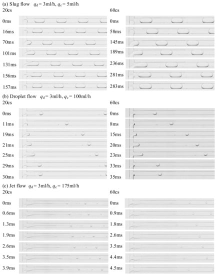 In this study, the formation processes of slug flow, droplet flow, and jet flow were observed and analyzed. Figure 6 shows the formation processes of three flow patterns in a water-silicone oil system as obtained by a high-speed camera.