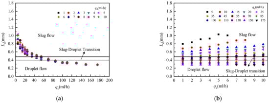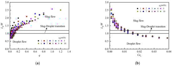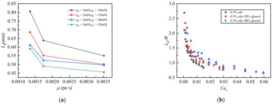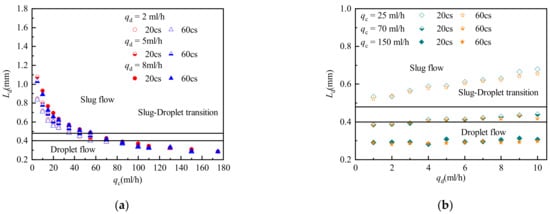 In this study, two groups of experiments were conducted, in which two different mass fraction glycerol aqueous solutions with 0.5% SDS were used as the continuous phase and silicone oil with a viscosity of 20 cs was used as the dispersed phase. Figure 8a,b respectively shows the droplet length versus continuous phase capillary number Cac and droplet length versus continuous phase viscosity. Figure 8a shows the effect of continuous phase viscosity on droplet length. Droplet length was found to decrease with increasing continuous phase viscosity. Figure 8b shows that the droplet lengths decreased exponentially with increasing Cac. The droplet length decreased with increasing viscosity, and the area occupied by slug flow decreased accordingly. As stated above, droplet length is significantly affected by continuous phase viscosity because an increase in continuous phase capillary number leads to an increase in the shearing effect of the continuous phase on the dispersed phase, making the droplet easier to break.