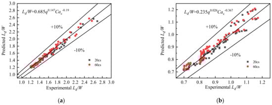 Slug flow and droplet flow are subject to different dominant forces, and therefore the droplet length scaling laws of the two flow patterns should be predicted separately to ensure their accuracy. As previously analyzed, the dimensionless droplet length Ld/W is positively correlated with q and negatively correlated with Cac. Therefore, the dimensionless droplet length can be written as a function of q and Cac where only the coefficients change. The predicted scaling laws for slug flow and droplet flow lengths are shown in Equations (3) and (4), respectively: