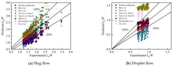 The experimental data in this paper were then compared with scaling laws mentioned in the literature [46,48,51,59,60,61]. Comparative results for the slug length and droplet length scaling laws are shown in Figure 12. The predicted values using Equations (3) and (4) were also included in this figure to show a clear comparison of these correlations.