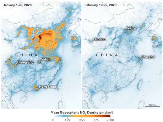 The COVID-19 pandemic has caused a disastrous turmoil on a global scale resulting in the slowdown of the global economy due to the repeated lock-down measures. However, the pandemic has also impacted the climate in a positive way due to the significant reduction of human activity whether transport or industrial output (Figure 1) [1]. The air pollution in all major cities significantly reduced over the lockdown periods, an unintended result of the pandemic [2,3].