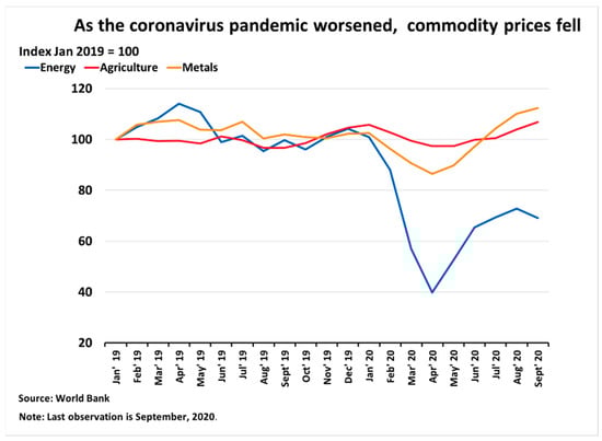 Drop in commodity prices due to COVID-19, the energy sector being the most affected. Adapted from World Bank [9].