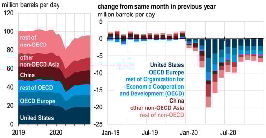 All commodity prices fell, while energy prices plummeted (Figure 2) resulting in the worst ever drop in oil demand, (Figure 3) [9]. Global demand for oil fell significantly over 2020. The U.S. Energy Information Administration (EIA) estimated that the world consumed 92.2 million barrels per day (b/d) of petroleum and other liquid fuels in 2020 representing a 9% decline compared to 2019. It’s the largest decline over the past 40 years (Figure 4). As a consequence, the oil price during the first pandemic wave reached the lowest values recorded for many years (Figure 5) while 20 April 2020 saw West Texas Intermediate (WTI) oil prices plunge from $17.85 to −37.63, more than a 300% drop, the largest one day drop for US crude in history, while reaching a negative price for the first time ever (Figure 6). Demand for all types of liquid fuels fell globally while at the same time stocks increased significantly. The relative warm weather in Europe further reduced demand for heating oil.