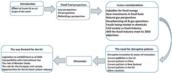 The research first analyses the effects of Covid-19 on oil and fossil fuels: then, a detailed investigation is carried out on the perspectives of fossil fuels, addressing all three fossil energy carriers, coal, oil and natural gas and presenting the recent strategies announced by the oil majors for net zero by 2050. The effects of various parameters on the fossil fuels—such as subsidies, new investments, carbon capture and sequestration as well as hydrogen technologies for decarbonizing the fossil fuels industry and the chemical market—are examined, also considering the actions undertaken by the civil society against the fossil fuels industry. This section then discusses whether the fossil fuels industry will be able to meet the PA2050 targets independently or not. Finally, the need for disruptive policies is debated, by increased use of renewable energy sources and decreased use of fossil fuels and looking carefully to the legislative options for the EU.