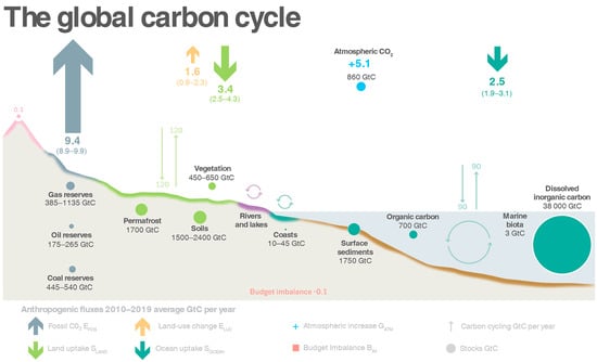 Two-thirds of global industrial greenhouse gas emissions over the past two centuries can be traced to the activities of the fossil fuels industry. Emissions generated by oil and gas companies’ products and processes have significantly increased the concentration of greenhouse gases in the atmosphere. In short, the oil and gas industry has played a major role in anthropogenic emissions. During the 2010–2019 period the additions of CO2 from fossil fuels averaged 9.4 Giga tons Carbon/year (GtC/y), (Figure 8). The biogenic system can only absorb 3.4 GtC/y and the ocean an additional 2.5 GtC/y, where it is having an acidification impact. Taking into account the land use change contribution of 1.6 GtC/y a considerable amount of 5.1 GtC/y is stored in the atmosphere [20].