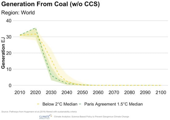 Generation from coal in Paris Agreement compatible and ‘Below 2 °C’ compatible pathways, Reproduced with permission from Climate Analytics [26].