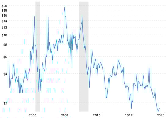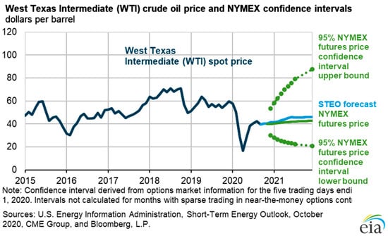 Oil was badly hit by the COVID-19 pandemic, as shown in previous Figure 2, with commodities related to transportation fuels affected dramatically. Oil prices plummeted since January reaching a historic low in April while temporarily oil traded at negative level [11,12]. In an effort to stabilize prices the Organization of the Petroleum Exporting Countries, Russia and other countries reached a tentative agreement in April to temporarily cut production by 10 million barrels a day; about 23% of their production levels [57]. Figure 11 shows the variation in the price for West Texas Intermediate (WTI) since August 2019. By early July the price of WTI had climbed back to about 40 US dollar, while Brent also traded close to $40 bbl−1 [58]. However, since then and up to November 2020 both prices are hovering around $40 bbl−1.