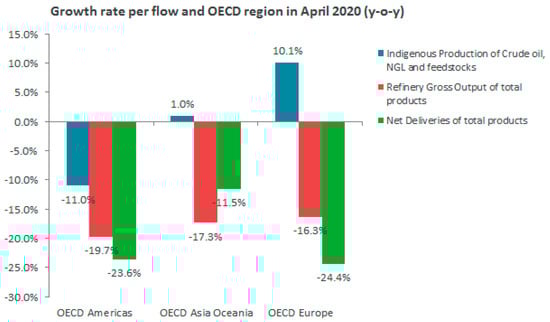 IEA predicted that oil demand in 2020 is expected to fall by 8.1 mbd−1, the largest in history, before recovering by 5.7 mbd−1 in 2021 [59]. Reduced jet and kerosene deliveries will impact total oil demand until at least 2022. However, stronger deliveries can be expected in China and India which may increase this by an additional 500 kbd−1 to 91.7 mbd−1. In both countries oil demand recovered fast in between April and May as the countries were restarting their economies due to Covid-19.