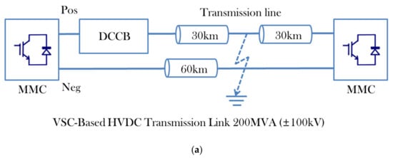 Figure 4a schematically shows the simulated VSC-based transmission circuit to test the DCCB proposed in this paper. The simulation was performed assuming that a fault occurs in 230 kV, 50 Hz, and 200 MVA transmission between the DCCB and a 30 km cable [22,23]. Assuming the fault current flowing to the DCCB in the rectifier stage in the schematic, the DCCB in this paper can break the fault current in both directions, so in the example, the DCCB could be placed on the adjacent stage of the modular multilevel converter (MMC) on the right.