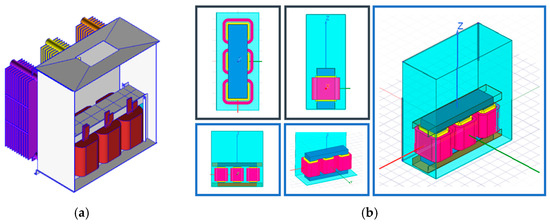 Standard design transformer 3D model for analysis: (a) transformer geometry using design system tool of the manufacturer; (b) equivalent geometry of the transformer in ANSYS Maxwell®.
