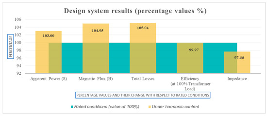 Regarding the comparison of the obtained results in this proposal with respect to other works, we find the following: in [24], the technical requirements for a step-up transformer in a photovoltaic distribution system are outlined and the design characteristics that must be considered to guarantee the correct operation of the transformer are included. However, the percentage variation in aspects such as capacity, magnetic flux, total losses, efficiency and impedance of the proposed design with respect to a conventional design is not reported. In this work, the percentage variation is considered (see Figure 11), so we cannot contrast the benefits or deficiencies of this work with the mentioned reference.