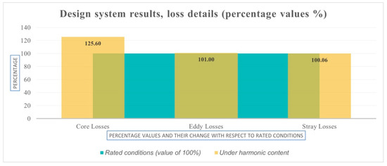 The data results obtained in FEM simulation were compared between the standard design and harmonic profile design to obtain a percentage change, as shown in Figure 11. The results show a similarity with the results using the manufacturer’s design software in Figure 3 and Figure 4, where an increase in magnetic flux density and loss is noticed, mainly in the core losses. It should be noted that the increase in total losses in the FEM analysis is 4.72% (close to 5.04% when using manufacturer’s design system tool calculations shown in Figure 3) and is an indication that the design will meet the required efficiency even with the harmonic profile considered.