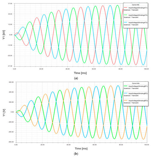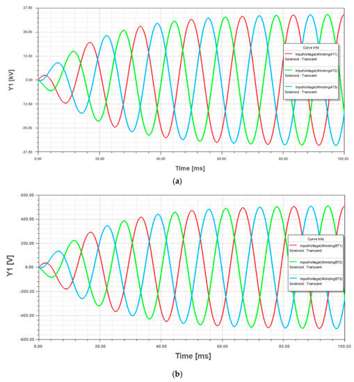 The simulation was performed using, as input data, the parameters obtained from the manufacturer design system software. In Figure 5, the winding excitation voltage results from the simulation are presented, where the maximum peak value for HV winding is 33.75 kV and for LV winding is 500 V. These results are adequate, mainly because they are similar to the nominal voltages of the study case transformer in Table A2.