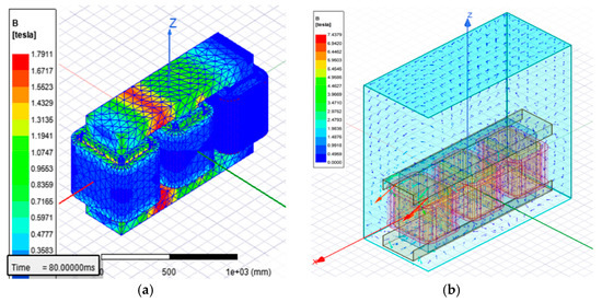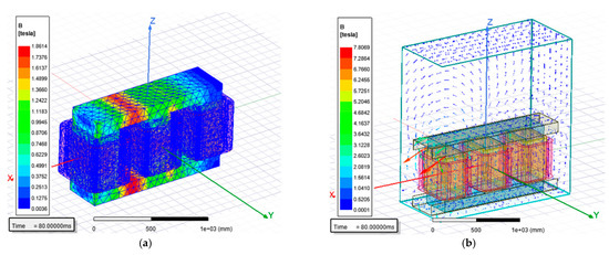 As presented in Figure 9, the flux density simulation distribution in the core of the transformer has a maximum value of 1.8614 Tesla and the maximum value of flux density in the tank is 7.8069 Tesla. In Figure 9a, the maximum value is observed between phase A and phase B in the upper and lower interval core section; this occurs during the continuous simulation results as described in Section 3.1.5, where the magnetic induction is concentrated and alternated between phases.