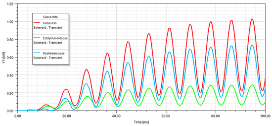 As shown in Figure 7, the total losses (Core Loss), eddy current losses, and hysteresis losses are calculated. The total losses calculation had a maximum value of 1.04 kW.