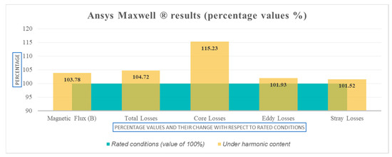 The percentage difference results from ANSYS Maxwell® simulation in Figure 11 corroborate the proportionality of change in the analysis, which concludes that the harmonic profile of the inverter does not represent a major problem for the transformer efficiency during rated operating conditions. However, the proposed methodology for SPP distribution transformers, where the harmonic profile current injection of the inverter (see Table A3) is used in the analysis, could affect the volt per turn in the windings; the results indicate an increase in the magnetic flux density above 1.72 Tesla, which is the minimum requirement for the design.