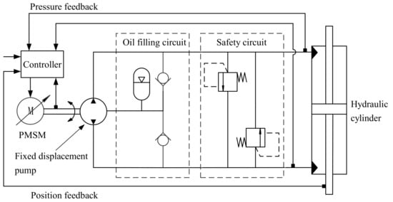 In the EHSPCS, the PMSM coaxial drives the fixed displacement pump, the suction and discharge ports of the fixed displacement pump are directly connected to the two load ports of the hydraulic cylinder, and the controller outputs control instructions to the PMSM to change the rotation speed and torque of the fixed displacement pump, so as to adjust the displacement and force of the hydraulic cylinder. The accumulator and check valve are used to replenish oil in the oil filling circuit. The safety circuit uses the pressure relief valve to prevent the pressure of the two chambers of the hydraulic cylinder from being too high. The hydraulic circuit of the system is shown in Figure 1.
