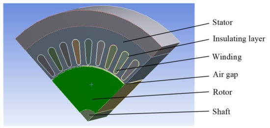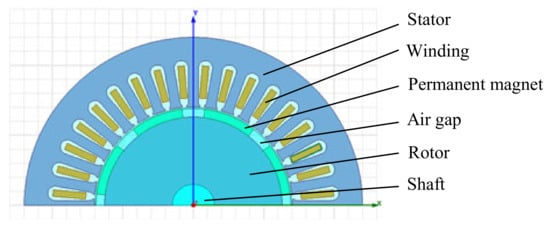 Since the electromagnetic performance of each part in the PMSM is symmetrical about the axial center plane, it is only necessary to establish a 1/2 model about the axial center plane when solving the electromagnetic field. The PMSM analytical model is shown in Figure 2.