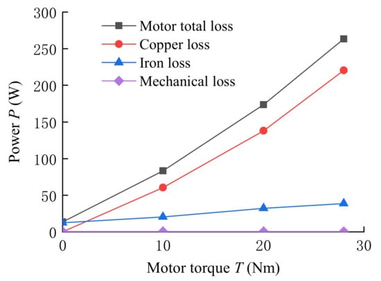 The loss in the working process of the motor is the main source of motor heating. Motor losses are mainly divided into stator iron loss, winding copper loss, and mechanical loss [23,24,25,26,27], the motor loss can be expressed as: