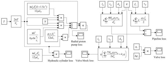 The losses of radial piston pumps include volume loss and mechanical loss, volume loss refers to the heat generated by the oil leaking into the shell through the three major leakage pairs (piston pair, sliding shoe pair, and distribution pair) during the operation of the piston pump, and mechanical loss refers to the heat generated by the friction between oil and rotor, shaft and bearing with the rotation of the radial piston pump [28]. Compared with volume loss, mechanical loss is negligible at low speed.
