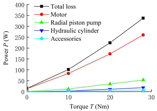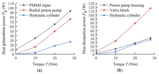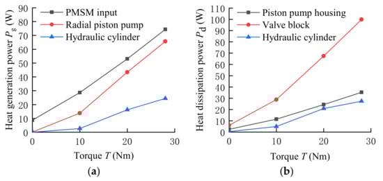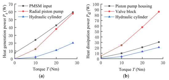 Since the heat of the system hydraulic accessories is smaller than that of the radial piston pump, the power loss of the pipeline, valve block, and valve is equivalent to the power loss of the hydraulic cylinder, which is collectively referred to as the power loss of the hydraulic cylinder. AMESim simulation software was used to calculate the heat generation power and heat dissipation power of each part of the system under the PMSM’s natural cooling conditions under different torques, as shown in Figure 16.