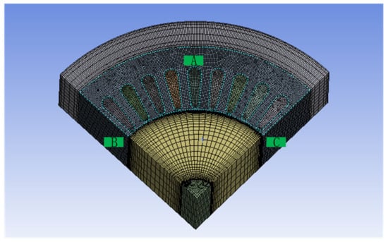 First of all, it is necessary to give initial conditions to the three-dimensional PMSM temperature field model. In this study, the initial ambient temperature is set to 25 °C. Secondly, it is necessary to assign boundary conditions to the model. According to the first formula of Equation (10), the thermal conductivity boundary conditions can be set by assigning the thermal conductivity of the various components of the motor. The second formula in Equation (10) is the adiabatic boundary condition, as shown in Figure 7, assuming that the A, B and C planes are all symmetry planes, which are the adiabatic planes in this study. The third formula in Equation (10) is the boundary condition of convection heat dissipation, which includes the stator winding, stator core, rotor core, shell, and permanent magnet contact surface with the air gap and outside atmosphere.