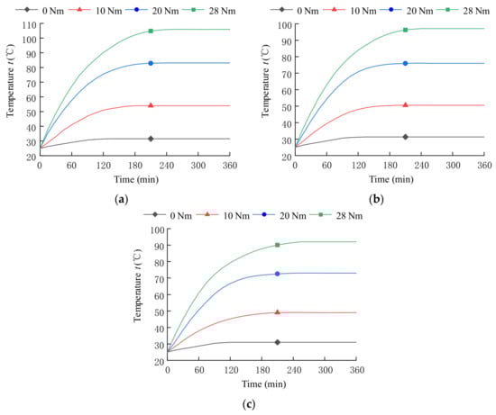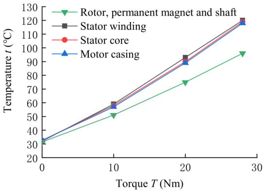 When the heat dissipation power of the system is equal to the heat generation power, the system reaches thermal balance. The thermal balance temperature of each component in the CHS under different torques under the PMSM’s natural cooling conditions is shown in Figure 17.