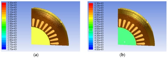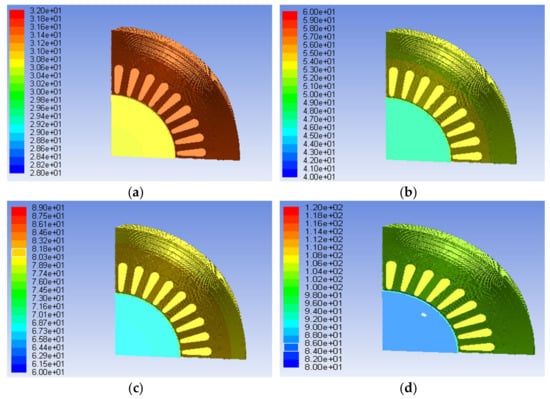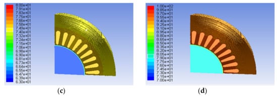 It can be seen in Table 2 and Figure 3 that the copper loss and iron loss are the main heat sources, and the mechanical loss accounts for the smallest proportion. From the perspective of the proportion, iron loss is the main heat source of PMSM under low torque, and the copper loss gradually becomes the main heat source of PMSM as the torque increases.