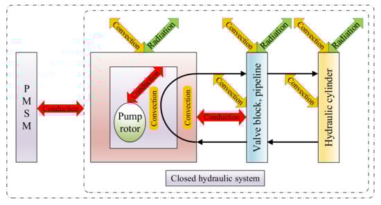 Electro-hydraulic servo pump control technology plays a very important role in high-precision control fields, e.g., aircraft rudder surface control [1], robot joint drives [2], and wind power variable paddle control [3], and is a core technology in industrial development. The electro-hydraulic servo pump control system (EHSPCS) adopts the concept of volumetric speed regulation under the permanent magnet synchronous motor (PMSM) drive mechanism. By changing the output speed and torque of the PMSM, the output flow and pressure of the fixed displacement pump can be controlled to achieve high-precision control of the position and force of the hydraulic cylinder. The introduction of electro-hydraulic servo pump control technology reduces the installation, operation, and maintenance costs of the system, improves the power-weight ratio and reliability [4,5,6], and solves the inherent defects of traditional valve control technology, namely, a high throttling loss, a high maintenance cost, and low integration [7], but the highly integrated design characteristics of the EHSPCS greatly reduce the effective heat dissipation area. Part of the heat converted by the electrical conductivity loss of the motor, the leakage loss of the fixed displacement pump and the hydraulic cylinder is dissipated into the surrounding environment through the shell, and the other part is trapped inside the component, causing the temperature of the system to rise [8,9]. When the PMSM temperature is too high, a high temperature alarm and shutdown will often occur. If the hydraulic oil temperature is too high, it will cause the oil to oxidize and decrease its viscosity, increase system leakage, and increase component wear. To ensure that the system can run stably for a long time, the research on the thermal balance temperature field of the EHSPCS becomes crucial.