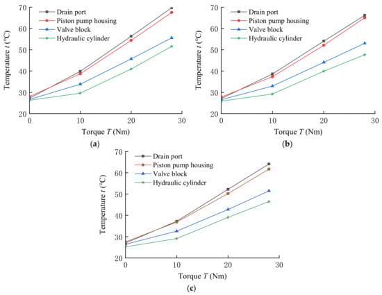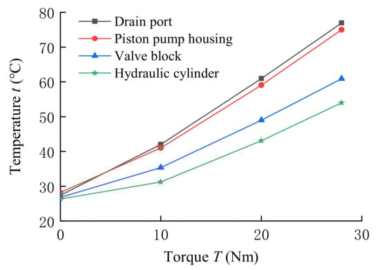 Figure 17 shows that the greater the torque, the higher the thermal balance temperature of each part of the system. In the presence of load, the temperature of the drain port of the radial piston pump has always been at a maximum, and the oil temperature exceeds the ideal value of 60 °C at the load of 20 Nm.