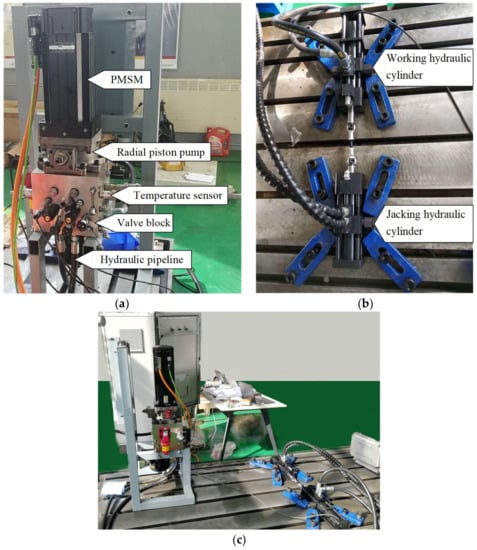 The working hydraulic cylinder and the power unit are connected by hydraulic pipelines. A jacking hydraulic cylinder and a working hydraulic cylinder are opposite to each other to provide a constant load for the system. The EHSPCS entails a working hydraulic cylinder in a static and jacking state. Once the thermal balance of the system is stable, the thermal balance temperature of the EHSPCS can be measured under different loads and under natural cooling and forced wind cooling. The PMSM has its own winding temperature detection device, and the CHS is equipped with an external threaded temperature sensor at the drain port, which can detect the temperature at the drain port in real time.