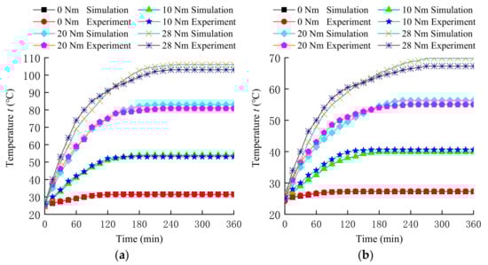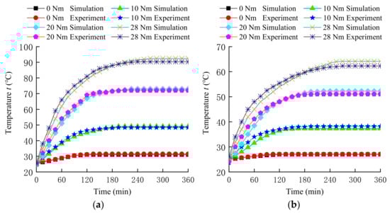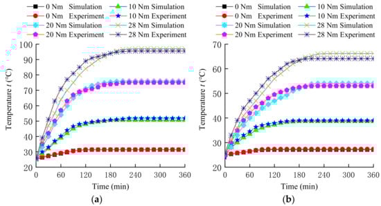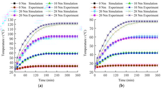 In this experiment, by changing the output force of the jacking hydraulic cylinder, loads with torques of 0 Nm, 10 Nm, 20 Nm, and 28 Nm were added, respectively. The simulation and experimental temperature rise comparisons of the stator winding and the drain port under different loads are shown in Figure 23.