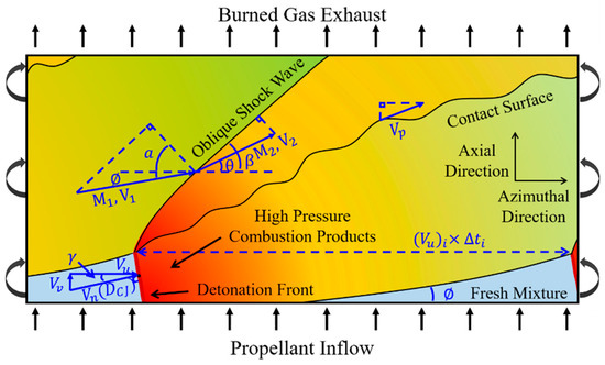 During the last decade, most efforts on detonation-based PGC studies shifted their attention to RDEs owing to their continuous operation characteristics in annular combustors, which are geometrically similar to those in aviation gas turbine combustors. The concept of RDEs was introduced in the 1960s [14], but attracted renewed interest in the mid-2010s [15] as an alternative to PDEs. Figure 1 shows the unwrapped two-dimensional schematics of the combustion flow field in an RDE combustor. The general configuration of an RDE comprises an annular channel where detonation waves run in a circumferential direction continuously, by consuming the incoming fuel and oxidizer. Thus, the RDE is similar to the open-type combustor, whereas the PDE is closer to the closed-combustor. Basically, the RDE, also known as a rotating detonation combustor, is a detonation-driven combustor, but it is more commonly referred to as a rotating detonation “engine” because it can produce thrust owing to the compression effect produced by the detonation.