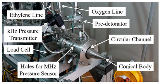 Figure 3 shows the experimental setup of the test equipment. Static pressures at the feed line, fuel and oxidizer supply, combustor channel, and pre-detonator are measured using a 2.0 kHz pressure transmitter (Keller PAA-23SY, 5.0 MPa 0.25% full scale). A dynamic pressure sensor (PCB 113B26, 3.45 MPa 1.0% F.S.), which can measure characteristic frequencies higher than 1.0 MHz, is used to investigate the detonation propagation characteristics and to calculate the detonation speed. The dynamic pressure sensor is installed at the combustor outer wall 3.0 mm downstream from the combustor head with a 4.0 mm recess. The recess is intended to minimize physical damage and electric signal error by avoiding exposure to the hot combustion product. The recess length is selected within L/D, here acoustic resonance does not occur. A 10.0 kHz load cell (Cas SBA-100L, 100.0 kgf 0.01% F.S.) is installed to measure the dynamic thrust. K-type sheath thermocouples, each having a 1.6 mm diameter, are used to check the temperatures of the fuel, the oxidizer, and the combustor outer wall. The purpose of using thermocouples is not to obtain instantaneous results, but to obtain average data through repeated experiments under the same conditions, and to measure the temperature of cold gas for mass flow rate. The main purpose of using the thermocouples is to obtain average data through repeated experiments under the same conditions. The measured data are acquired using a Yokogawa DL850E ScopeCoder, wherein the data sampling rate is set to five times based on the dynamic pressure sensor. A visualization of the detonation wave rotating inside the combustor is captured using a Phantom v2512 mono-type high-speed camera with a Nikon 80–400 mm lens. The high-speed camera is located 5.5 m downstream from the combustor exit.