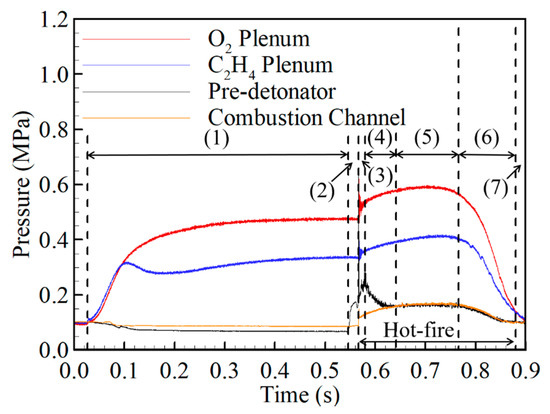 Experiments are conducted after determining the response characteristics of the fuel and oxidizer supply system and the experimental model. The operational sequence is controlled by a programmable logic controller (PLC). Figure 4 shows the results of pressure variations at major locations operated by the sequence. During the initial period (1), the propellant supply begins and the pressure reaches a steady state in the propellant supply plenum chambers and combustors. The pre-detonator initiates at the beginning of period (2). The detonation is initiated in the RDE combustion channel during period (3). The hot fire combustion test begins during period (3) and continues through periods (4), (5), and (6). A steady state is obtained at the beginning of period (5) at the main combustor channel. Pressure in the propellant supply plenum chambers decreases during period (6), and the hot fire combustion test terminates. Purging occurs during period (7). Separate tests were conducted for thrust measurement, lasting for approximately 0.6 s, and for dynamic pressure measurements lasting for approximately 0.2 s. The test time is reduced for dynamic pressure measurement to protect the pressure sensor from the thermal load, as no cooling is being applied yet for the sensor. The test time for the thrust measurement was selected to be three times that of the dynamic pressure measurement, because a sufficiently long test time is required to get a reliable average thrust.