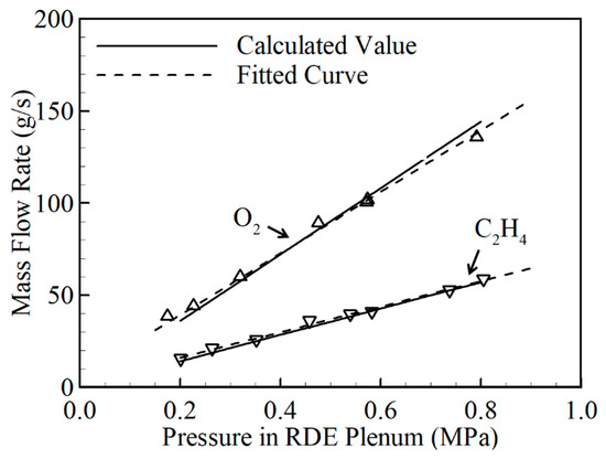 The mass flow rates of the fuel and oxidizer are measured in a classical manner. The mass flow rates are estimated by measuring the weights of gas cylinders before and after the cold flow test [17]. Gas cylinders of 3.4 L (initial pressure is approximately 10 MPa) and precision balance (A&D GP-20K, 21.0 ± 0.001 kg) were used for the measurement. Experiments for the estimation of mass flow rate were conducted three times for 1.5 s for every RDE under supply pressure conditions less than 0.8 MPa, and the results are plotted in Figure 5. The error bar is not plotted in this figure because the errors are smaller than the sizes of the symbols in this figure, except in the case of 0.2 MPa. The results for the mass flow rates are compared with the theoretical estimation obtained by assuming isentropic flow. The deviations are 12.4% and 8.2% for fuel and oxidizer, respectively. The maximum error was found for the case of 0.2 MPa supply pressure, but was less than 10% in all other cases. During the combustion experiment, the mass flow rate is obtained by using the fitted curve of Figure 5. Combustion experiments were conducted in cases where the mass flow rate is confirmed, and where the total mass flow rate is less than 180 g/s. In addition, experiments for the investigation of the detonation propagation characteristics were conducted under the near-stoichiometric condition, while the thrust performance was examined for a range of equivalence ratios from 0.3 to 2.5.