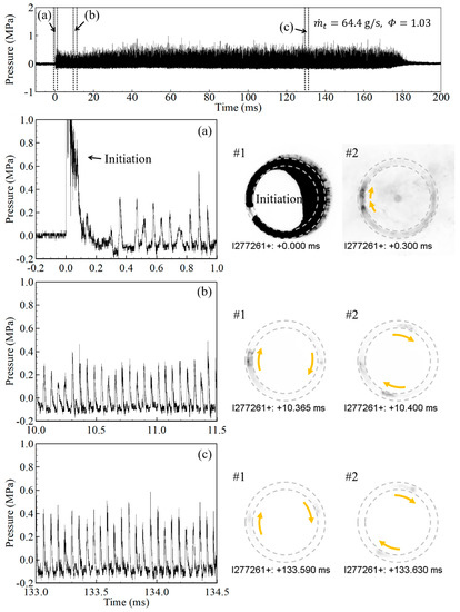 Figure 6 is the pressure record obtained by the dynamic pressure sensor of the RDE combustor channel for the case where = 64.4 g/s and = 1.03. It is regarded as one of the typical results, where the total duration is 180 ms from detonation initiation to extinction, which varies slightly with the supply pressure. The initial variation is plotted in Figure 6a. A strong shock wave arises just after the initiation from the pre-detonator, and the detonation wave begins to rotate after approximately 0.5 ms. Specific events and visualization images during this phase are plotted in Figure 7.