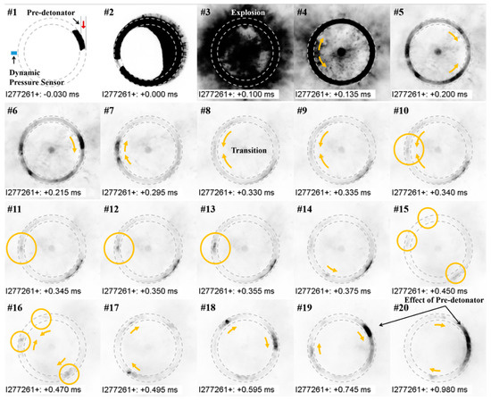 Snapshots of the detonation initiation and transition process captured at 256 × 256 resolution and 200 kilo-frames per second (kfps). The event times and experimental conditions correspond to Figure 6a.