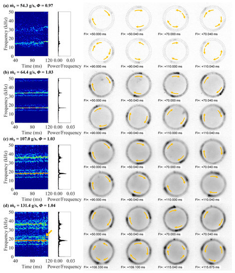 Figure 8 shows the detonation propagation characteristics related to the change in total mass flow rate under stoichiometric conditions ( = 1.0 ± 0.05). The dominant frequencies were investigated using fast Fourier transform (FFT) and short-time Fourier transform (STFT). The behavior of the detonation waves was identified using images captured at a 256 × 256 resolution and 200 kfps. The behavior of the detonation waves related to the total mass flow rate is as follows. Figure 8a shows a state in which the irregular detonation waves propagate during the combustion time, and a series of processes of the initiation, propagation, decaying, and merging of the detonation waves continues. As shown in the pressure record at the top of Figure 9, irregular behavior with changes in pressure and speed (time difference between waves) occurs continuously. In Figure 8b,c, two stable detonation waves are shown propagating. In Figure 8d, two stable detonation waves are mostly shown to propagate, but three stable detonation waves were temporarily captured on two occasions after the irregular detonation waves propagated (after approximately 95 ms), as shown in the STFT result (yellow arrow) and the pressure record at the bottom of Figure 9. The number of detonation waves is known to depend on the diameter of the combustion channel and the influent mass flux of the fuel and oxidizer [15,29].