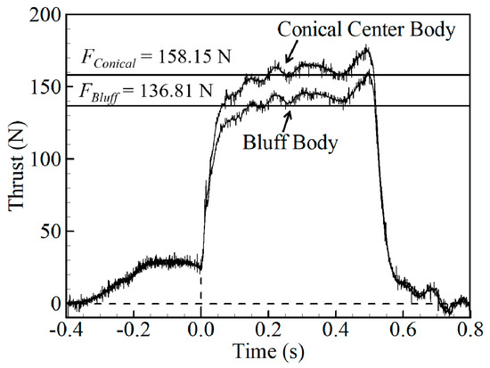 When the conical center body was used, the average thrust and specific impulse increased approximately 21.34 N and 12.50 s, respectively, compared to when the bluff body (non-conical center body) was used. Figure 13 shows the specific impulse related to the presence of the conical center body under various mass flow rate conditions. The application of a conical center body increases the specific impulse by a maximum of 14.08 s.