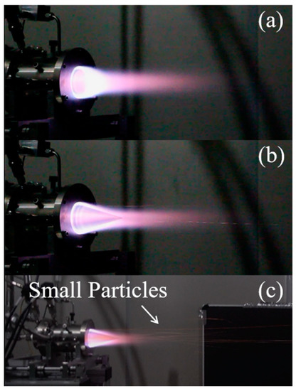 Pictures of RDE plume: (a) with bluff body at = 152.6 g/s, = 0.45; (b) with conical center body at = 163.0 g/s, = 0.47; (c) small particles owing to the ablation (3840 × 2160 resolution using Sony RX-100M5 camera).
