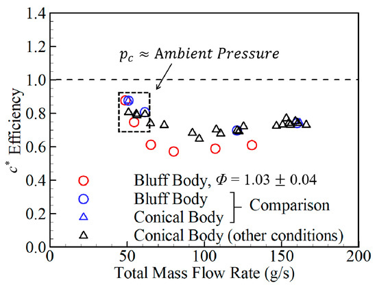 Figure 14 shows the characteristic velocity efficiency expressed as the ratio of the ideal and measured characteristic velocity, suggesting that the increase in thrust and specific impulse related to the presence of a conical center body is not a result of an increase in the total mass flow rate (blue symbols). The application of the expansion nozzle of 30.0° did not dramatically improve the thrust and specific impulse. However, it has a positive effect on the thrust performance. Therefore, the nozzle is necessary to achieve meaningful and valid thrust performance.