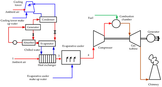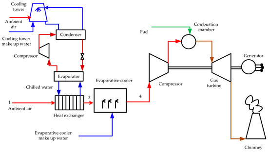 Gas turbine inlet air cooling (TIAC) is a well-known technology that is used to improve gas turbine performance [1,2,3,4], where gas turbine power increases at a low cost per kW. Various approaches for cooling the turbine inlet air have been used. Gas turbines have ambient temperature sensitivity, where both the capacity and efficiency decrease as the ambient temperature increases. The compressor section of the gas turbine’s power demand is proportional to the absolute temperature of the inlet air. The compressor mass flow rate capacity is proportional to the air density at the compressor inlet, which is inversely proportional to the absolute temperature. Therefore, high ambient temperature negatively affects both the capacity and efficiency of the turbine.