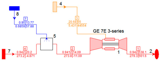 Figure 7 shows a schematic of the turbine and inlet cooling system as presented in Thermoflex for gas turbines with evaporative inlet cooling (Figure 2). The surrounding ambient air (7) is cooled from state 4 to state 2, as it is humidified in the evaporative cooler (5) using a water source (8). The temperature at the evaporative cooler exit, state 2, is limited by the wet-bulb temperature of the ambient air.